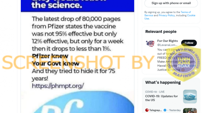Akun Twitter For Our Rights (@LevanaLomma1) mengunggah cuitan berupa gambar yang di dalamnya terdapat klaim bahwa efektivitas vaksin Prizer bukan 95%, namun hanya sebesar 12% yang bertahan selama 1 minggu dan kemudian turun ke angka kurang dari 1% berdasarkan dokumen baru sebanyak 80.000 halaman yang diterbitkan Pfizer. Cuitan yang diunggah pada 19 Juni 2022 mendapat atensi berupa 2 rb suka dan 596 retweet.