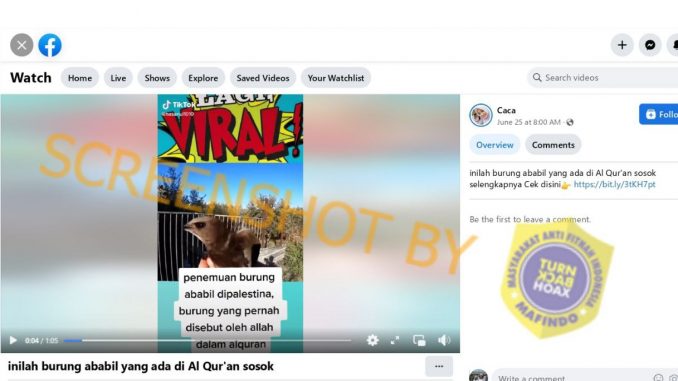 Akun Facebook bernama “Caca” mengunggah video dengan klaim penemuan burung ababil di Palestina. Di dalam video tersebut juga terlihat burung yang dipegang oleh seorang pria, yang diklaim sebagai burung ababil.