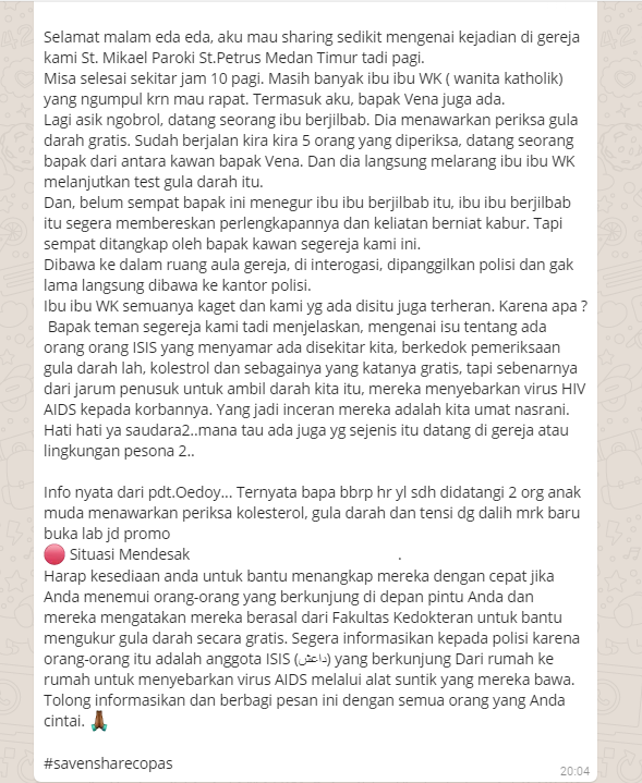 Informasi dari pesan berantai yang menyatakan bahwa ada anggota ISIS tengah menyebarkan virus HIV AIDS melalui program cek gula darah gratis di gereja-gereja di Medan adalah hoaks. Pesan berantai tersebut merupakan hoaks berulang yang pernah tersebar pada bulan Mei 2017. Perbedaannya hanya terdapat pada narasi dan tempatnya. Pada hoaks sebelumnya disebutkan tempatnya di Aceh, Malang, Pasuruan, dan Yogyakarta, maka kali ini disebutkan terjadi di Medan. Munculnya hoaks tersebut menumpangi momen isu terorisme yang tengah hangat.