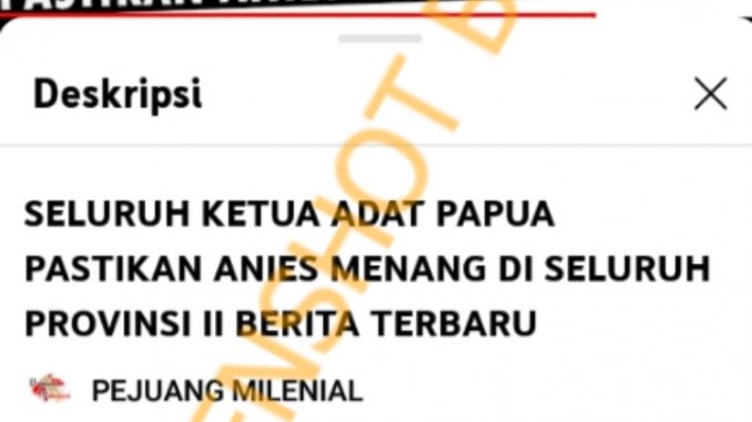 Beredar sebuah video di kanal Youtube dengan judul, “Meledak, KETUA ADAT PAPUA TURUN GUNUNG Pastikan Anies Mennag di 2024”. Tampilan depan dari video ini juga menunjukkan gambar Anies Baswedan bersama beberapa orang dengan memakai riasan khas Papua.