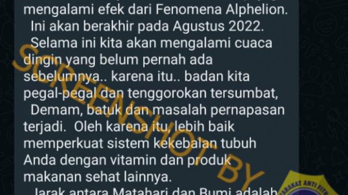 Beredar sebuah pesan berantai Whatsapp yang menyebutkan Indonesia akan mengalami fenomena Albelian dari bulan Juli hingga Agustus 2022, dengan narasi sebagai berikut: