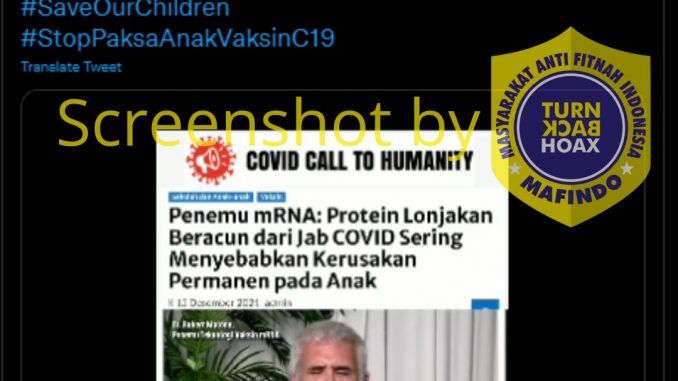 Beredar kembali melalui media sosial twitter video Penemu cairan ekperimen terapi genetika mRNA yang menyampaikan 3 masalah utama jika vaksin diberikan kepada anak anak. salah satunya adalah spike protein beracun yang menyebabkan kerusakan permanen pada anak.