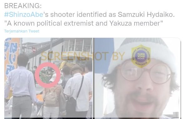 Akun Twitter @EOA_Bants mengunggah foto dan cuitan yang terdapat narasi bahwa penembak Shinzo Abe bernama Samzuki Hydaiko yang dikatakan sebagai seorang ekstremis politik terkenal dan anggota Yakuza.
