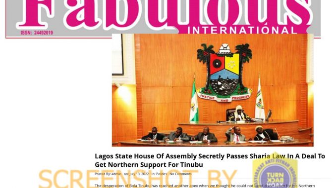 Situs Fabulous International menulis artikel tentang dewan majelis negara bagian Lagos, Nigeria, yang secara diam-diam mengesahkan hukum syariah demi mendapatkan dukungan untuk Bola Tinubu, gubernur Lagos yang mencalonkan diri kembali. Artikel tersebut juga menjelaskan bahwa hukum syariah tersebut telah ditandatangani dan resmi menjadi undang-undang oleh gubernur Lagos saat ini.
