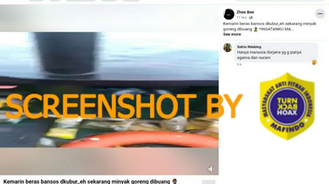Akun Facebook dengan nama pengguna “Zhee Bee” (https://www.facebook.com/profile.php?id=100083257688430) mengunggah sebuah video yang menunjukkan beberapa kemasan minyak goreng mengapung di laut. Video tersebut juga disertai dengan narasi yang menyatakan bahwa video tersebut merupakan video minyak goreng yang dibuang ke laut.