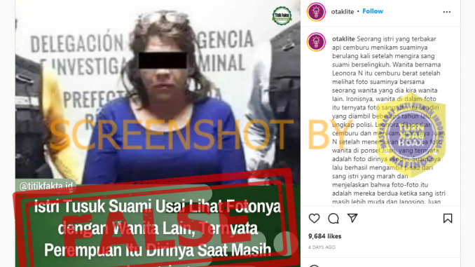 Beredar sebuah postingan oleh akun instagram Otaklite dengan narasi “Seorang istri yang terbakar api cemburu menikam suaminya berulang kali setelah mengira sang suami berselingkuh…”. Terdapat sebuah foto yang diedit dengan tulisan ” Istri Tusuk Suami Usai Lihat Fotonya Dengan Wanita Lain ,Ternyata Perempuan Itu Dirinya Saat Masih Langsing”.