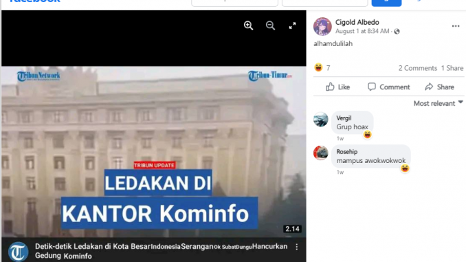 Sebuah akun Facebook mengunggah gambar yang berasal dari kanal youtube Tribun Timur berjudul “Detik-detik Ledakan di kota Besar Indonesia Serangan ok SubatDungu Hancurkan Gedung Kominfo”. Dalam video tersebut terlihat sebuah gedung yang hancur terkena rudal dan diklaim merupakan gedung Kementerian Kominfo.