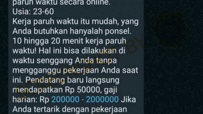 Beredar pesan Whatsapp lowongan kerja dari Departemen Sumber Daya Manusia (SDM) Tokopedia. Dalam pesan tersebut menyebutkan posisi sebagai karyawan paruh waktu untuk usia antara 22 tahun sampai 55 tahun dengan gaji sebesar Rp 200.000-2.000.000.