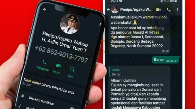 Beredar akun Whatsapp Wakil Bupati Serdang Bedagai Adlin Umar Yusri Tambunan dengan nomor “+6285290137797”. Akun tersebut memakai nama dan foto profil Adlin memakai pakaian dinas serta menawarkan penyaluran donasi kepada tempat ibadah/Lembaga.