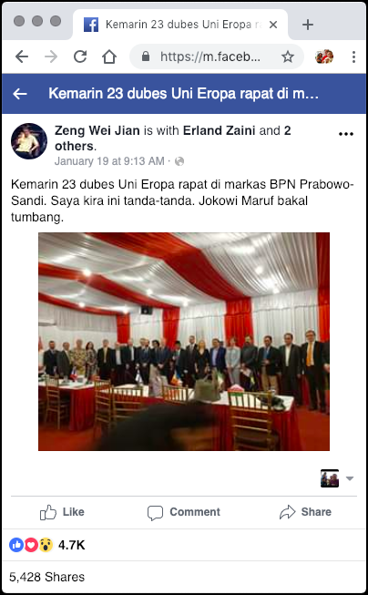 “Kemarin 23 dubes Uni Eropa rapat di markas BPN Prabowo-Sandi. Saya kira ini tanda-tanda. Jokowi Maruf bakal tumbang.” tulis akun Zeng Wei Jian