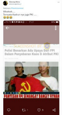 Akun Twitter dengan nama pengguna “mumungwisnu_1” mengunggah sebuah foto hasil tangkapan layar yang menunjukkan artikel berjudul “Polisi Benarkan Ada Upaya dari FPI dalam Penyebar Kaos & Atribut PKI”. Di gambar yang diunggah, terdapat foto dua pemuda sedang memegang kaus merah dengan gambar palu arit berwarna kuning.