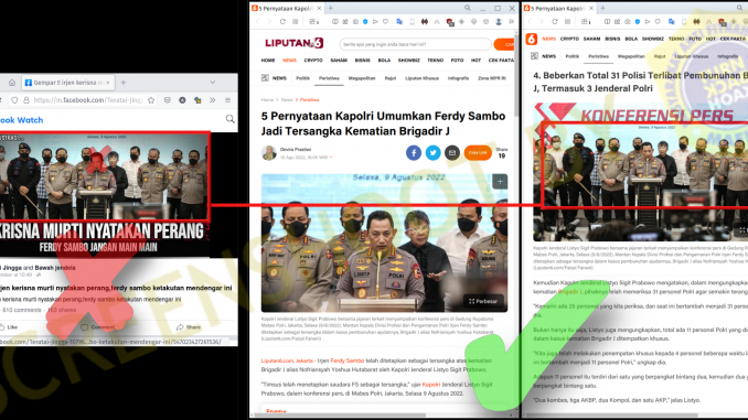 Salah satu foto ASLI yang identik dengan gambar pratinjau yang menggunakan foto hasil suntingan dengan mengganti bagian kepala Listyo Sigit Prabowo dengan kepala Krishna Murti, Liputan6.com pada 10 Agu 2022 (deskripsi foto): “Kapolri Jenderal Listyo Sigit Prabowo bersama jajaran terkait menyampaikan konferensi pers di Gedung Rupatama Mabes Polri, Jakarta, Selasa (9/8/2022). Mantan Kepala Divisi Profesi dan Pengamanan Polri Irjen Ferdy Sambo ditetapkan sebagai tersangka dalam kasus pembunuhan ajudannya, Brigadir J alias Nofriansyah Yoshua Hutabarat. (Liputan6.com/Faizal Fanani).
