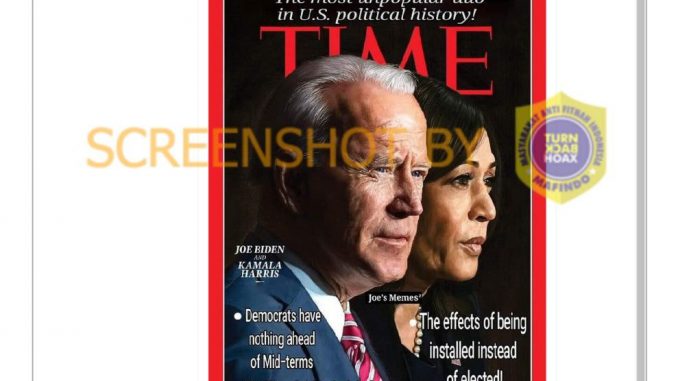 Akun Twitter @nyetengale mengunggah foto cover majalah TIME yang menampilkan Presiden AS Joe Biden dan wakilnya Kamala Harris dengan judul “The most unpopular duo in U.S political history”. Cuitan dan gambar yang diunggah pada 10 November tersebut telah disukai oleh 348 orang, serta telah dikutip dan dibagikan ulang hampir 200 kali.