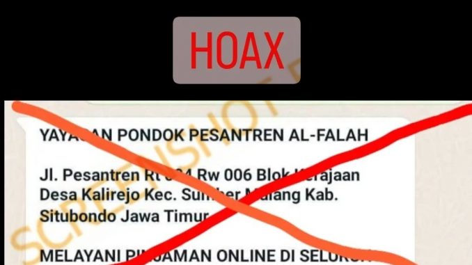 Beredar pesan WhatsApp tawaran pinjaman online oleh Ponpes Al-Falah Sumber Malang, Situbondo. Dalam pesan tersebut terdapat keterangan alamat pesantren serta melayani pinjaman online seluruh Indonesia.