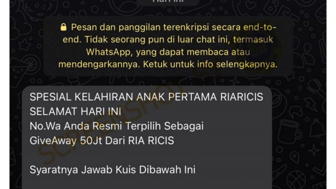 Beredar pesan WhatsApp giveaway spesial kelahiran anak pertama Ria Ricis sebesar 50 Juta dengan syarat menjawab pertanyaan kuis lalu dikirimkan ke nomor WhatsApp 082188407678.