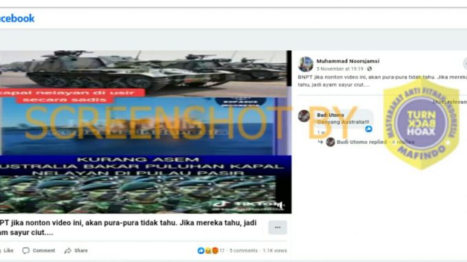 Beredar sebuah unggahan di media sosial Facebook, yang berisi video kapal-kapal yang dibakar dan ditenggelamkan, serta cuplikan dari berbagai video berita. Dalam keterangannya, pemilik akun bernama Muhammad Noorsjamsi mengklaim bahwa video itu merupakan peristiwa di Pulau Pasir. Disebutkan pula, bahwa puluhan kapal-kapal milik nelayan Indonesia telah diusir secara sadis oleh Australia.