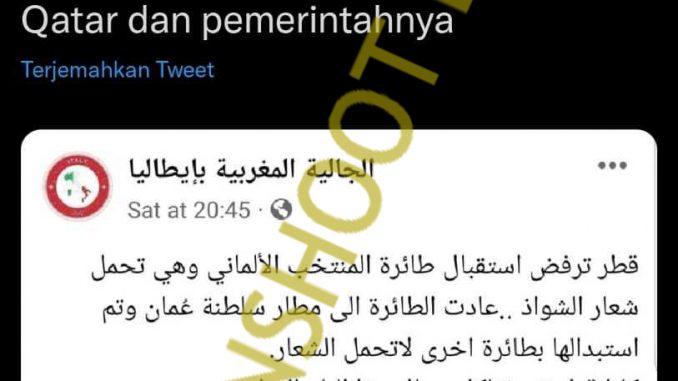 Akun twitter bernama @eRS_AREMA021 membagikan sebuah cuitan disertai lampiran gambar dengan narasi yang menyatakan bahwa Qatar menolak pendaratan pesawat timnas Jerman yang bergambar atribut LGBT dan berganti pesawat lain yang tidak menggunakan atribut LGBT.