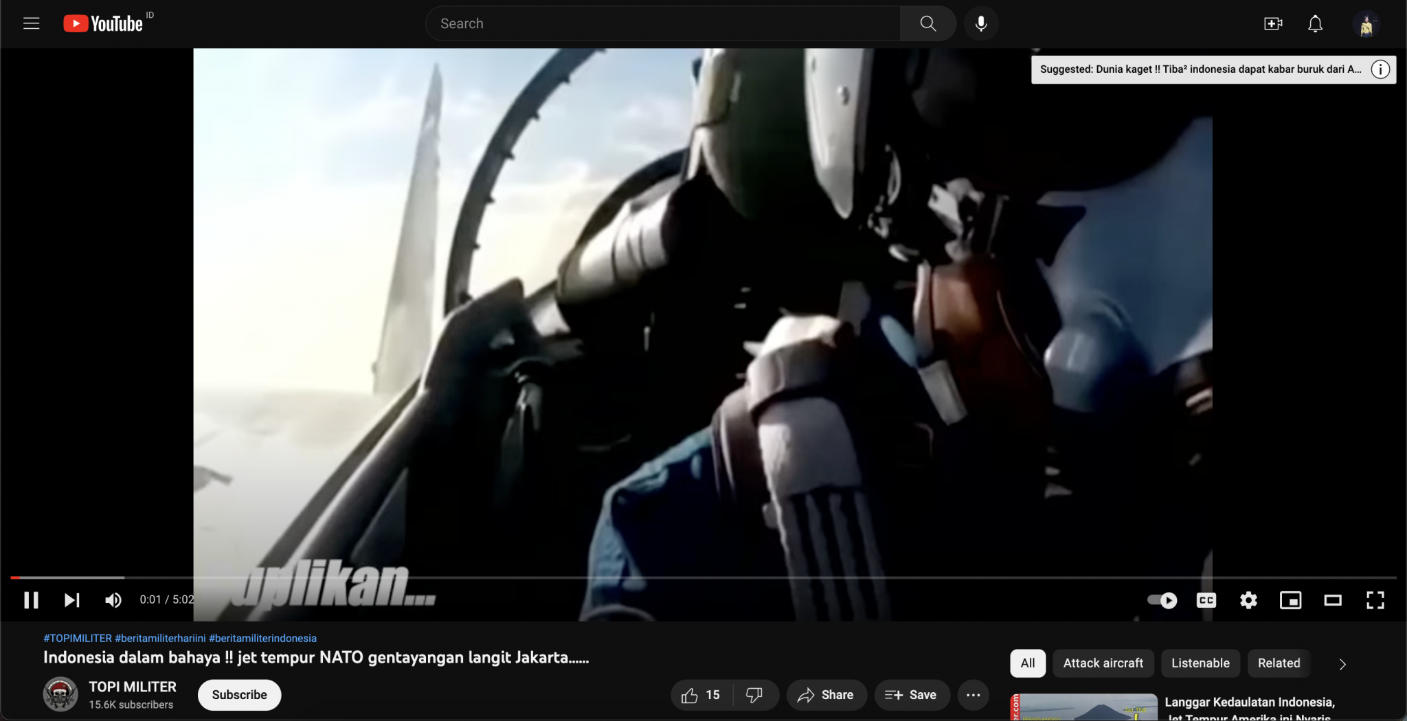Kanal Youtube TOPI MILITER mengunggah video dengan klaim Indonesia dalam ancaman bahaya, karena jet tempur NATO terbang di langit Jakarta.