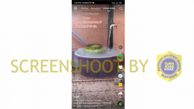 Beredar video Tiktok yang memperlihatkan cara mengatasi tabung gas yang bocor dengan cara merendamnya ke dalam air. Dalam video tampak asap dan gelembung udara keluar dari tabung gas. Hal ini diklaim pengunggah video @king8 bahwa seluruh gas mampu keluar dengan direndam air dan mencegah terjadinya ledakan.