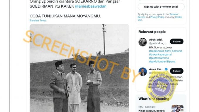 Orang yang berdiri diantara SOEKARNO dan Pangsar SOEDIRMAN itu KAKEK @aniesbaswedan”.
