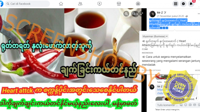 Klaim tersebut salah, faktanya tidak ada penjelasan ilmiah yang membenarkan bahwa orang yang mengalami serangan jantung secara mendadak dapat diselamatkan dengan bubuk cabai yang diseduh dengan air panas, sebaliknya ahli berpandangan bahwa informasi tersebut dapat membahayakan pasien. Selengkapnya di bagian penjelasan.