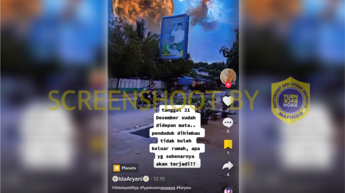 Banyak ditemukan video di Tiktok yang mengklaim bahwa akan terjadi fenomena alam berbahaya pada tanggal 21 Desember 2022. Salah satunya akun @idaaryani yang menuliskan keterangan pada videonya agar tidak boleh keluar rumah pada tanggal tersebut. Faktanya, fenomena yang akan terjadi tanggal 21 Desember tidak berbahaya untuk manusia.