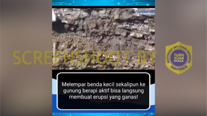 Hoaks lama beredar kembali. Video dua orang melempar benda ke kawah gunung yang diklaim menyebabkan lava bergejolak adalah salah. Faktanya, barang yang dibuang adalah sampah organik beratnya 30 kg. Tidak semua benda yang dimasukkan ke kawah gunung dapat meleleh atau terbakar.