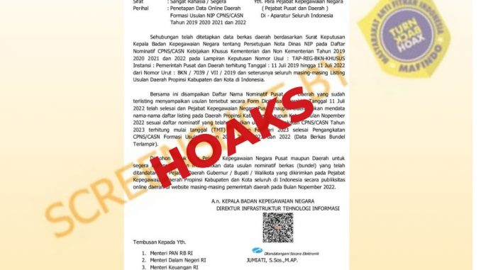 Berdasarkan pada seluruh referensi surat penetapan data online daerah formasi usulan Nomor Induk Pegawai (NIP) Calon Pegawai Negeri Sipil/Calon Aparatur Sipil Negara (CPNS/CASN) tahun 2019, 2020, 2021, dan 2022 ialah palsu dan masuk ke dalam kategori konten tiruan.