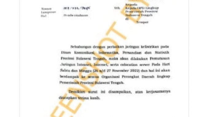 Berikut narasi yang dicantumkan: “Sehubungan dengan perbaikan jaringan kelistrikan pada Dinas Komunikasi, Informatika, Persandian, dan Statistik Provinsi Sulawesi Tengah, makan akan dilakukan pemutusan jaringan Internet, Internet, serta colocation server pada hari Sabtu dan Minggu (26 s/d 27 November 2022) dan hal ini akan berdampak ke semua Organisasi Perangkat Daerah lingkup pemerintah Provinsi Sulawesi Tengah.