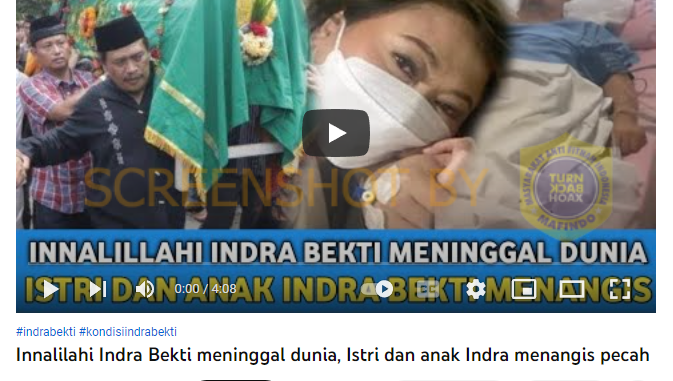 Kanal Youtube bernama Dunia Artis mengunggah video dengan judul “Innalilahi Indra Bekti meninggal dunia, Istri dan anak Indra menangis pecah”. Dalam thumnail video tersebut juga terdapat rangkaian foto presenter tersebut tengah berbaring di kasur rumah sakit dan ada pula gambar orang-orang yang tengah menggotong keranda jenazah.