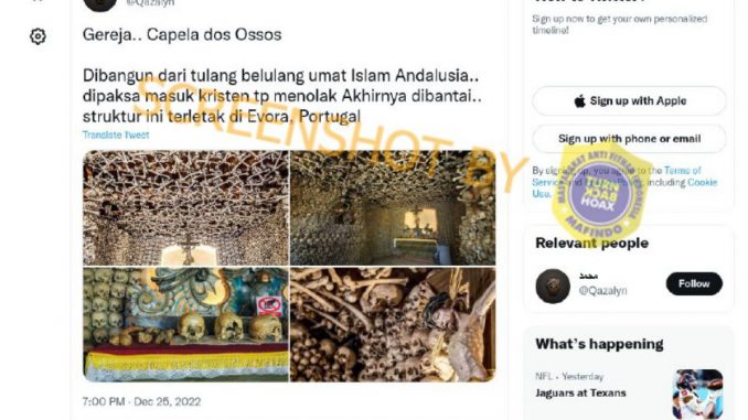Akun Twitter @Qazalyn mengunggah gambar yang memperlihatkan tembok sebuah gereja yang dipenuhi tengkorak dan tulang belulang manusia. Gambar-gambar tersebut diklaim sebagai Gereja Capela dos Ossos di Evora, Portugal, yang dibangun dengan tulang belulang umat Islam Andalusia yang menolak masuk Kristen pada abad ke-17.