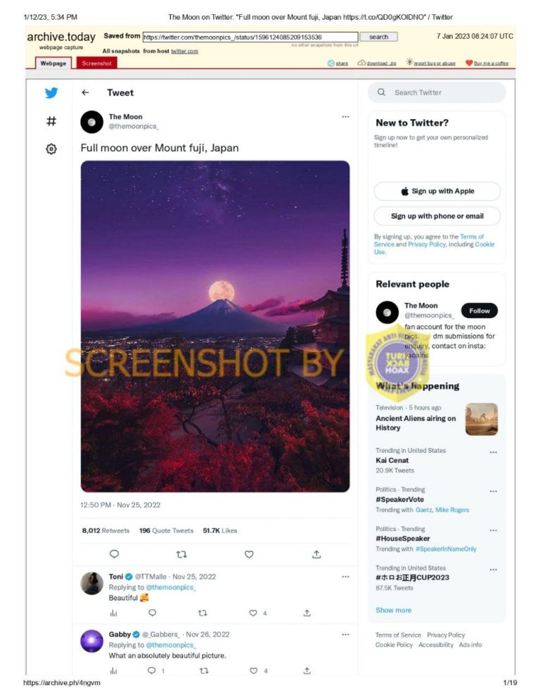 Akun Twitter @themoonpics_ mengunggah foto bulan purnama di atas gunung, yang kemudian diklaim sebagai Gunung Fuji di Jepang. Cuitan dan foto yang diunggah pada 25 November tersebut telah disukai hampir 52,000 orang, serta telah dibagikan dan dikutip ulang hampir 10,000 kali.