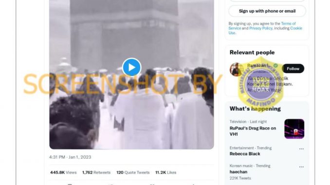 Akun Twitter @ramazanizoltr mengunggah video dan menulis cuitan yang memperlihatkan salju turun di Ka’bah, serta Masjidil Haram yang menjadi putih karena diselimuti banyak salju. Cuitan dan video yang diunggah pada 1 Januari tersebut telah disukai oleh hampir 11,500 orang, serta telah dibagikan dan dikutip ulang hampir 2,000 kali.