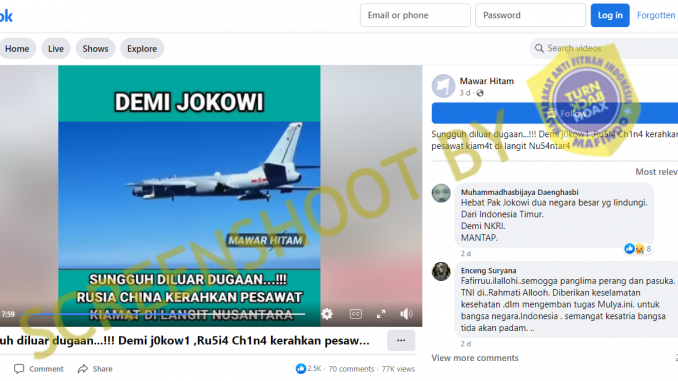 Akun Facebook Mawar Hitam (https://web.facebook.com/MawarHitam0) pada 6 Januari 2023 mengunggah sebuah video yang menampilkan beberapa cuplikan penerbangan pesawat pengebom atau bomber milik Rusia dan China. Dalam unggahan tersebut, terdapat narasi yang menyebutkan bahwa Rusia dan China sedang melakukan patroli udara bersama di atas Kepulauan Pasir NTT dalam rangka melindungi Indonesia dari serangan susulan Australia.