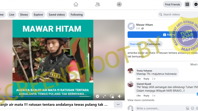 Akun Facebook Mawar Hitam (https://web.facebook.com/MawarHitam0) pada 6 Januari 2023 mengunggah sebuah video yang tidak memiliki keterkaitan antara judul dengan isi konten. Pemilik akun tersebut menuliskan judul mengenai ratusan tentara andalan milik Amerika yang telah tewas tak bernyawa. Namun pada kenyataannya, isi dan narasi dari video tersebut justru membahas mengenai personel TNI yang bertugas untuk menjaga perbatasan demi menjaga kedaulatan NKRI.