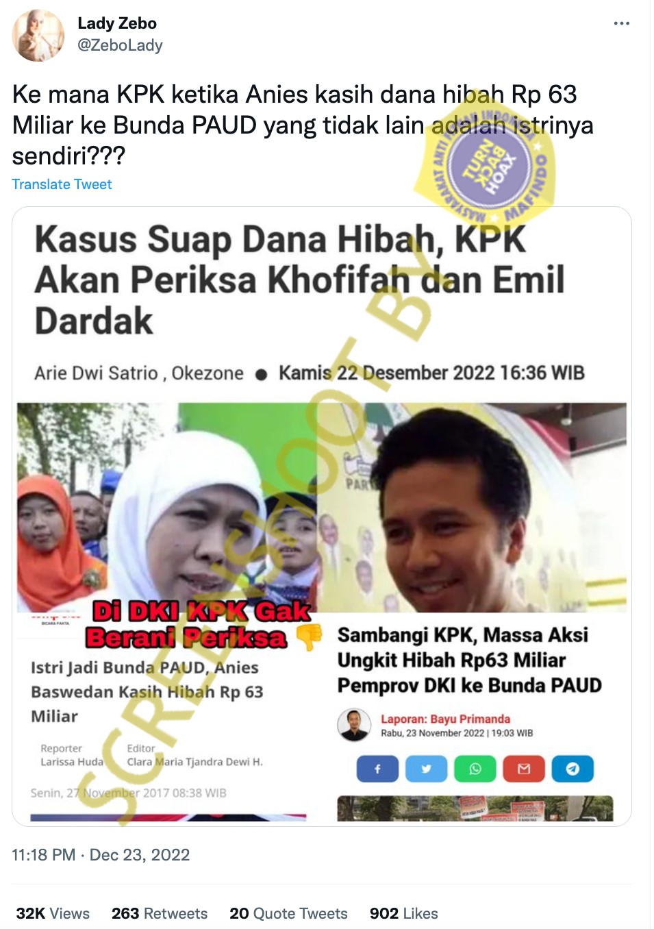 Akun Twitter Lady Zebo membagikan tangkapan layar dengan klaim bahwa Anies Baswedan memberikan dana hibah sebesar Rp63 Miliar untuk istrinya. Dalam cuitannya tersebut, Lady Zebo mempertanyakan keberadaan KPK yang tidak menindak Anies.