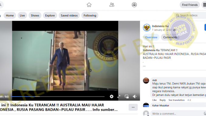 Akun Facebook Indonesia Ku (https://web.facebook.com/profile.php?id=100089233776344) pada 7 Januari 2023 mengunggah video dengan klaim bahwa Amerika Serikat menuduh Indonesia meminta bantuan ke Rusia untuk menghadapi konflik dengan Australia. Adanya konflik Indonesia-Australia ini dipicu oleh kapal-kapal milik Australia yang nekat beroperasi di Pulau Pasir yang merupakan Zona Ekonomi Eksklusif (ZEE) Indonesia. Selain itu, Australia juga telah memberikan klaim sepihak mengenai kepemilikan atas Pulau Pasir. Australia yang didukung penuh oleh militer Inggris telah mengerahkan armada kapal selam bertenaga nuklir di pantai sebelah barat Australia. Sementara itu, Indonesia telah membentuk pasukan khusus yang didukung oleh Rusia dan Iran, serta telah memiliki sistem pertahanan udara yang kuat berupa pangkalan rudal jarak jauh yang telah ditempatkan secara merata di sekitar Jakarta.