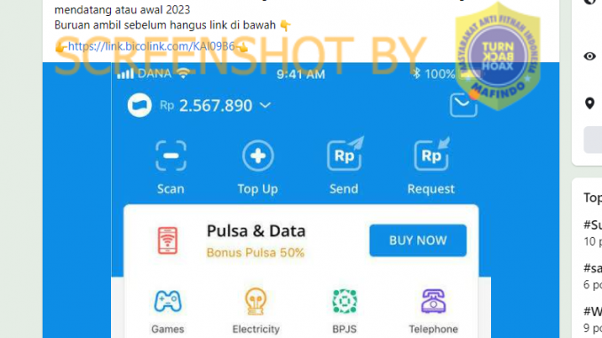 Namun setelah ditelusuri lebih lanjut, diketahui jika bantuan tersebut adalah palsu alias hoaks. Melansir dari Kompas.com, pihak DANA Indonesia menyatakan jika link yang disematkan pada narasi tersebut berpotensi adanya percobaan phishing.