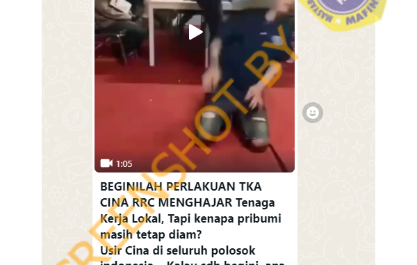 Beredar sebuah video yang menampilkan seseorang tengah ditendang berkali-kali tepat pada bagian muka dan leher. Video berdurasi satu menit tersebut disebarkan melalui aplikasi percakapan WhatsApp, beserta narasi yang menyebut “BEGINILAH PERLAKUAN TKA CINA RRC MENGHAJAR Tenaga Kerja Lokal”.