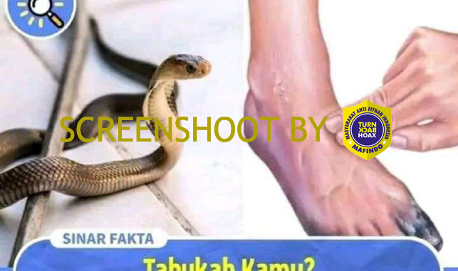 Informasi yang menyesatkan. Faktanya. tidak ada bukti yang membenarkan bahwa mengatasi gigitan ular dengan hanya membuat ramuan dari tumbukan kunyit, seledri, dan minyak kayu putih. Cara yang tepat saat terkena gigitan ular adalah imobilisasi, yakni membuat bagian tubuh yang tegigit agar tidak bergerak sepenuhnya.