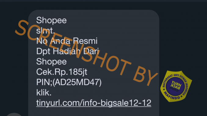 Beredar sebuah pesan melalui SMS yang menyampaikan bahwa Shopee membagikan hadiah sebesar Rp185Juta kepada nomor yang dituju dari SMS tersebut, dalam pesan tersebut juga disampaikan bahwa penerima pesan diarahkan untuk mengunjungi tautan Tinyurl yang diberikan dan menghubungi nomor WhatsApp tercantum. Setelah dikunjungi, tautan tersebut mengarah pada sebuah web blogspot.