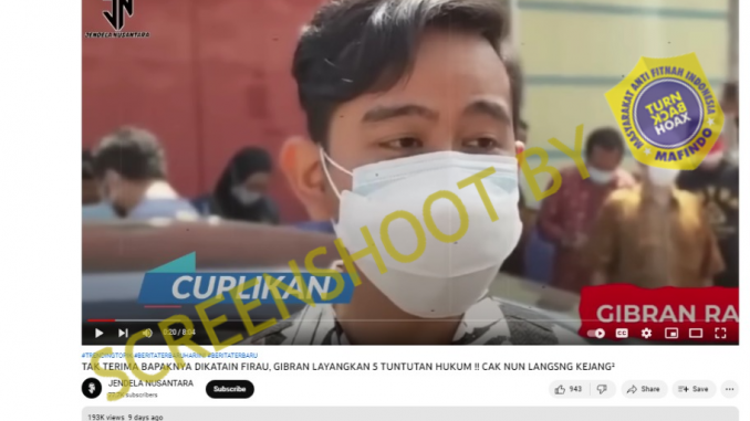 Akun Youtube JENDELA NUSANTARA mengunggah video dengan judul “TAK TERIMA BAPAKNYA DIKATAIN FIRAU, GIBRAN LAYANGKAN 5 TUNTUTAN HUKUM !! CAK NUN LANGSNG KEJANG²” pada tanggal 21 Januari 2023. Dalam video yang diunggah disebutkan bahwa Gibran sedang mencari orang yang menghina Jokowi dan apa yang dilakukan oleh Gibran agar membuat Cak Nun disertai dengan cuplikan wawancara Gibran, dan video Cak Nun.
