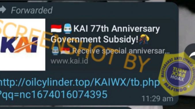 Beredar sebuah pesan berantai melalui WhatsApp yang berisi tautan kuesioner PT KAI yang berhadiah Rp5,000,000 dalam rangka merayakan hari jadi PT KAI yang ke-77. Dalam tautan tersebut juga disebutkan bahwa hadiah tersebut merupakan subsidi pemerintah bagi warga beruntung yang mengisi kuesioner tersebut.