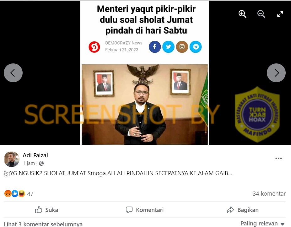 Akun Facebook Adi Faizal pada 21 Februari 2023 memposting sebuah gambar tangkapan layar artikel DEMOCRAZY News. Artikel tersebut berjudul “Menteri yaqut pikir-pikir dulu soal sholat Jumat pindah di hari Sabtu”.