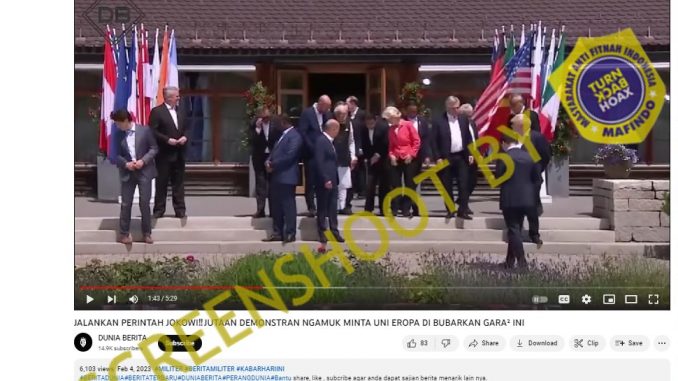 Konten yang dimanipulasi. Konten merupakan cuplikan video KTT G7 di Elmau, Jerman dan video sidang paripurna DPR untuk mengesahkan RKUHP yang diedit dengan diberi narasi yang tidak sesuai. Tidak ada demonstrasi yang meminta Uni Eropa dibubarkan seperti yang tercantum pada judul.