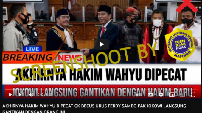Beredar sebuah pemberitaan bahwa hakim Wahyu telah dipecat dan Jokowi menggantikannya dengan orang lain karena dianggap tidak becus dalam mengusut kasus Sambo. Pemberitaan itu hadir di sebuah kanal Youtube bernama Roda Politik yang mengunggah video berdurasi 8 menit pada 8 Februari 2023 lallu.