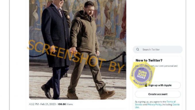 Akun Twitter @atensnut mengunggah foto yang memperlihatkan Presiden Joe Biden dan Volodymyr Zelenskyy bergandengan tangan, yang dilengkapi dengan klaim bahwa Presiden Zelenskyy harus memegang tangan Biden supaya Joe Biden tidak pergi kemana-mana. Cuitan dan foto yang diunggah pada 21 Februari lalu tersebut telah disukai hampir 5,000 orang serta telah dikutip dan dibagikan ulang lebih dari 1,000 kali.