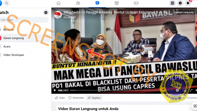 Beredar sebuah unggahan di Facebook dengan narasi yang menyebut bahwa Ketua Umum PDI Perjuangan, Megawati Soekarnoputri, dipanggil Bawaslu. Dalam narasi pada thumbnail video yang disematkan, menyebut bahwa panggilan tersebut buntut dari ucapannya yang mengakibatkan Bawaslu mem-blacklist PDI Perjuangan dari peserta Pilpres sehingga tidak bisa mengusung Capres. Diketahui pemilihan presiden terdekat akan dilaksanakan pada tahun 2024.