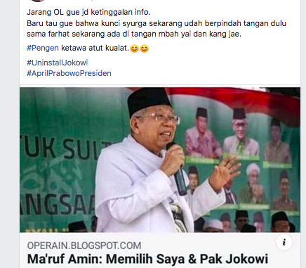 Postingan akun Facebook Ranya Alfarizi (@ranya.alfarizi) yang berisi screenshot artikel berjudul “Ma’ruf Amin: Memilih Saya & Pak Jokowi Sama Saja Sudah Mengantongi Tiket Surga” yang ditayangkan operain.blogspot.com dapat dikategorikan sebagai disinformasi. Blog tersebut sudah tidak dapat diakses dan tak ditemukan juga di pemberitaan media daring lainnya.