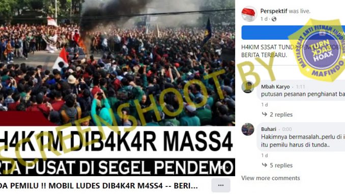 Beredar video dari halaman facebook bernama Perspektif dengan narasi yang mengklaim bahwa mobil hakim ludes dibakar massa akibat tunda pemilu.